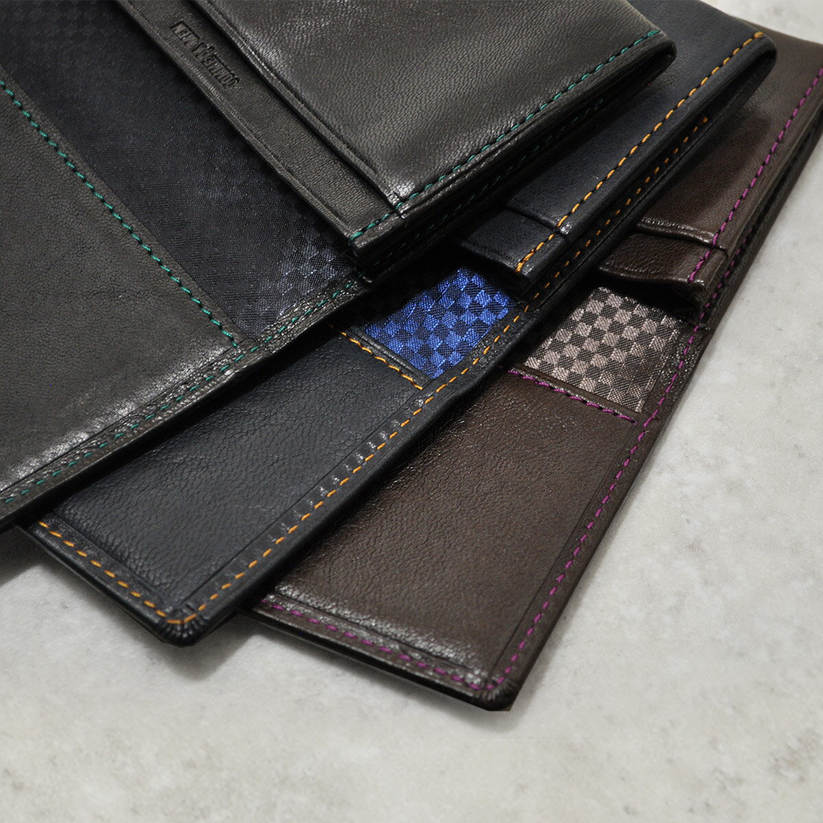 型押しロゴを配置したシンプルデザインながら、それぞれに合わせたカラーステッチと内装の格子柄で遊び心と個性をプラス。